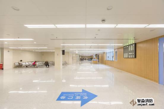 診室候診區燈具、噴頭、風口、煙感排布精細美觀,橫成排、豎成行、斜成線,錯落有致。