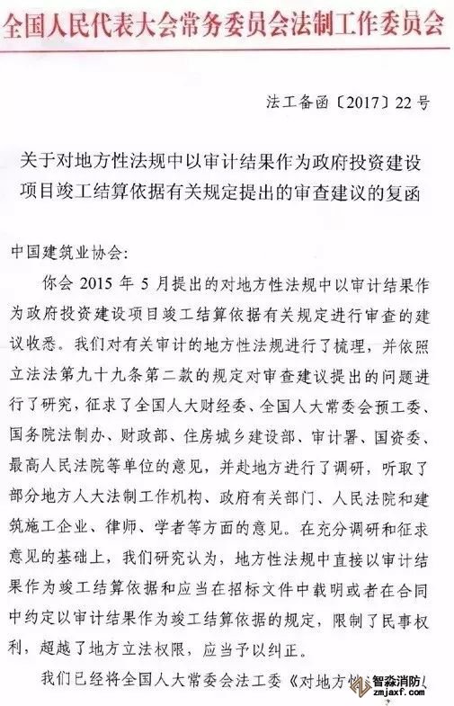 建筑行業內關注的“以審計結果作為建設工程竣工結算依據”問題,在2017年全國人大常委會法工委復函明確:應當予以糾正。