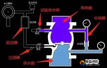 1、濕式報(bào)警閥結(jié)構(gòu)中名稱如圖所示,相對(duì)來(lái)說(shuō)比較簡(jiǎn)單。其中延遲器和補(bǔ)償器都是防止管網(wǎng)內(nèi)水流波動(dòng)導(dǎo)致閥組誤開(kāi)啟的措施。試驗(yàn)放水閥可以在閥組上開(kāi)啟后,達(dá)到只開(kāi)啟閥組而不用運(yùn)轉(zhuǎn)整個(gè)系統(tǒng)來(lái)測(cè)試閥組的功能的作用。閥瓣伺應(yīng)狀態(tài)下封閉住報(bào)警管路,當(dāng)閥瓣開(kāi)啟后,水流流入報(bào)警管路,充滿延遲器,觸動(dòng)壓力開(kāi)關(guān)、水力警鈴報(bào)警。