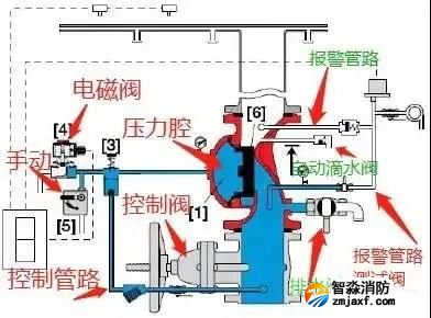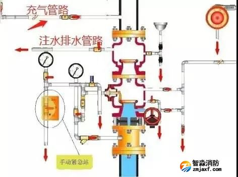 預(yù)作用閥組,從結(jié)構(gòu)上是雨淋閥與濕式閥的組合。其管路以及功能上和濕式閥和雨淋閥的設(shè)置以及功能均相同。為什么預(yù)作用閥組上部一定要配一個(gè)濕式報(bào)警閥,主要原因是系統(tǒng)側(cè)充有有壓氣體,需要濕式報(bào)警閥來(lái)實(shí)現(xiàn)密封氣體。