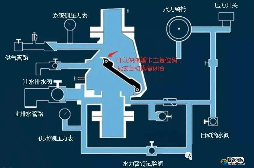 5)試驗(yàn)結(jié)束或者火災(zāi)撲救完之后,系統(tǒng)側(cè)的水全部從主排水管路排出(此時(shí)閥瓣仍是開(kāi)啟狀態(tài),被復(fù)位銷(xiāo)卡住無(wú)法返回)。
