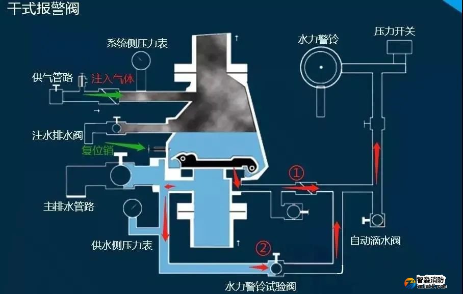 3)圖示中路線①為報(bào)警路線,發(fā)生火災(zāi)后閥瓣開(kāi)啟,水流進(jìn)入報(bào)警管路(后續(xù)和濕式一致不再重復(fù))。這里關(guān)鍵是當(dāng)閥瓣開(kāi)啟后由于干式報(bào)警閥閥瓣的前端結(jié)構(gòu),使其可以順時(shí)針通過(guò)復(fù)位銷(xiāo),而無(wú)法逆時(shí)針自動(dòng)復(fù)位(會(huì)卡在復(fù)位銷(xiāo)位置)。