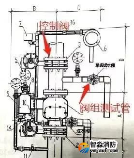 4)圖示路線②為報(bào)警管路測(cè)試管路,只需按照②路線開(kāi)啟水力警鈴試驗(yàn)閥,即可不開(kāi)啟閥瓣從而測(cè)試報(bào)警功能。